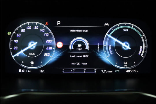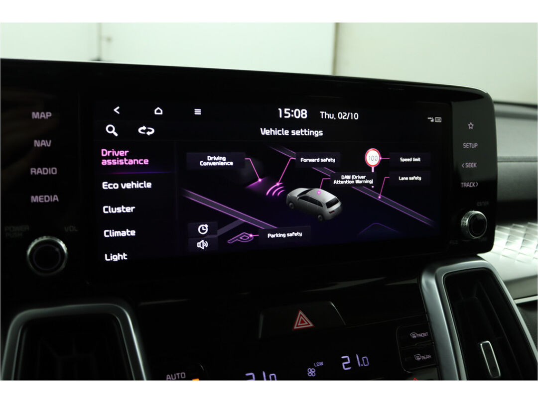 Het rijden met deze Kia wordt nog meer ontspannen dankzij de innovatieve technieken die onderweg over uw veiligheid waken. Onderweg zorgt verkeersborddetectie ervoor dat u geen waarschuwingsbord mist. Indien u onbedoeld de rijstrook lijkt te verlaten, reageert het Lane-keeping systeem meteen en corrigeert. Het systeem van forward collision warning, of in gewoon Nederlands 'botswaarschuwing', treedt in werking als de sensor te weinig afstand signaleert met een voor- of tegenligger. In deze Kia vinden we verder een hill hold functie, vermoeidheidsherkenning, autonoom remsysteem en bandenspanningcontrolesysteem.